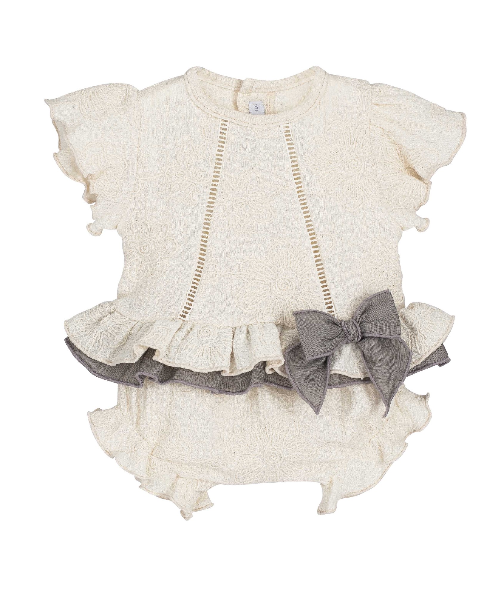 onjunto de bebé compuesto por blusón en tono beige/arena con bordado floral en el tejido, manga corta con volante y detalle de pasamanería/entredós vertical en el delantero. Lleva doble volante en el bajo con acabado a contraste en tono gris y lazo lateral a juego. Incluye braguita/cubrepañal coordinada con volantes, para un look elegante y cómodo, ideal para ocasiones especiales.