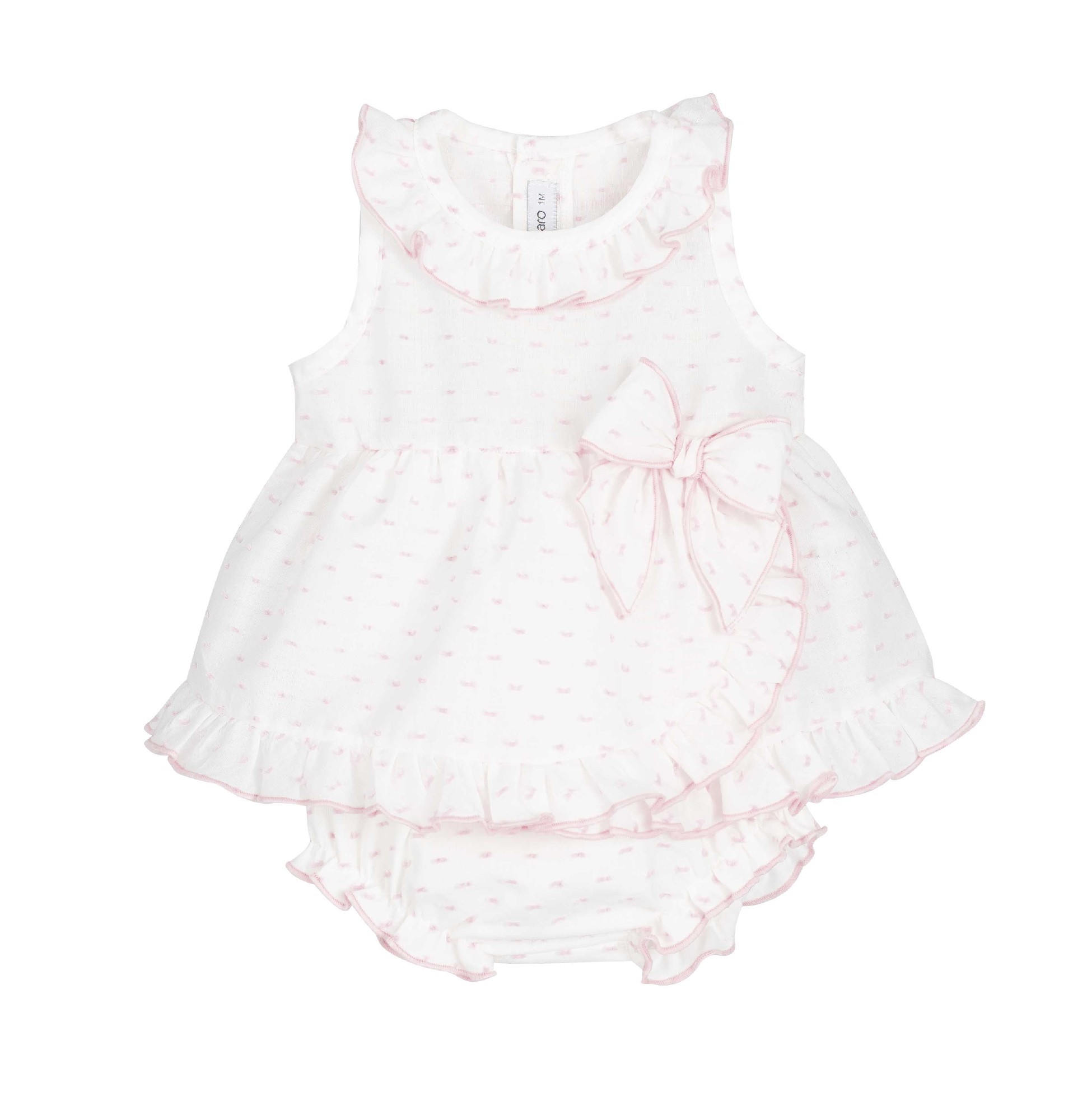 Conjunto de bebé compuesto por vestido tipo blusón sin mangas en tejido blanco con microestampado rosa, con cuello volante y vivo rosa a contraste. Lleva lazo grande lateral y doble volante en el bajo para un acabado más especial. Incluye braguita/cubrepañal a juego con volantes y ribete rosa, con cintura y piernas elásticas para mayor comodidad. Ideal para verano y ocasiones especiales.